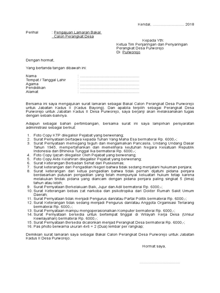 B surat pernyataan bertaqwa kepada Tuhan Yang Maha Esa yang dibuat oleh yang bersangkutan di atas kertas bermaterai. Sebagai bahan pertimbangan bersama ini saya lampirkan persyaratan administrasi calon perangkat desa. Contoh Surat Lamaran Jadi Sekretaris Desa Berikut adalah contoh surat lamaran kerja sebagai berikut.
